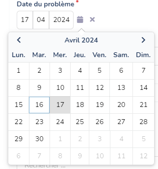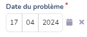 En édition, plusieurs champs apparaissent permettant de saisir la date, ainsi qu'un bouton "Calendrier" qui permet de sélectionner la date dans un calendrier.
