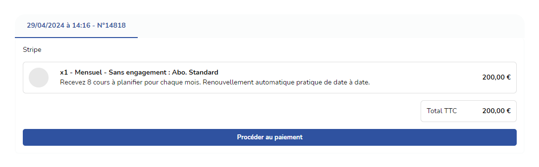 - Récurrence du paiement : Le champ utilisé pour associer une récurrence au paiement Stripe, il peut aussi contenir une période d'engagement. Habituellement il s'agit d'un menu déroulant unique.