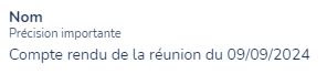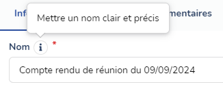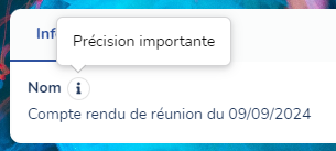 - Application : Précisions sur le champ : Lorsque la précision sur le champ est remplie, elle fait apparaître un icône d'information à côté du label lorsque le champ est affiché en visualisation ;